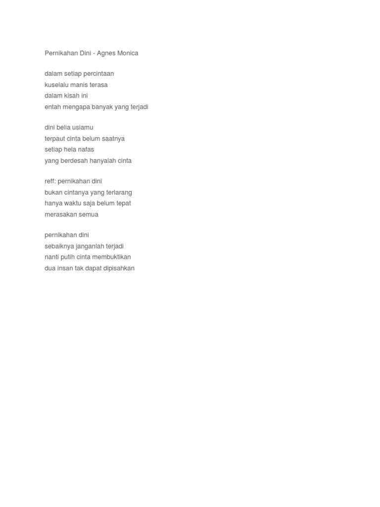 Lirik Lagu Pernikahan Dini Melly Goeslaw Indeed lately has been hunted by users around us, maybe one of you. People now are accustomed to using the net in gadgets to see image and video data for inspiration, and according to the name of the article I will discuss about Lirik Lagu Pernikahan Dini Melly Goeslaw.