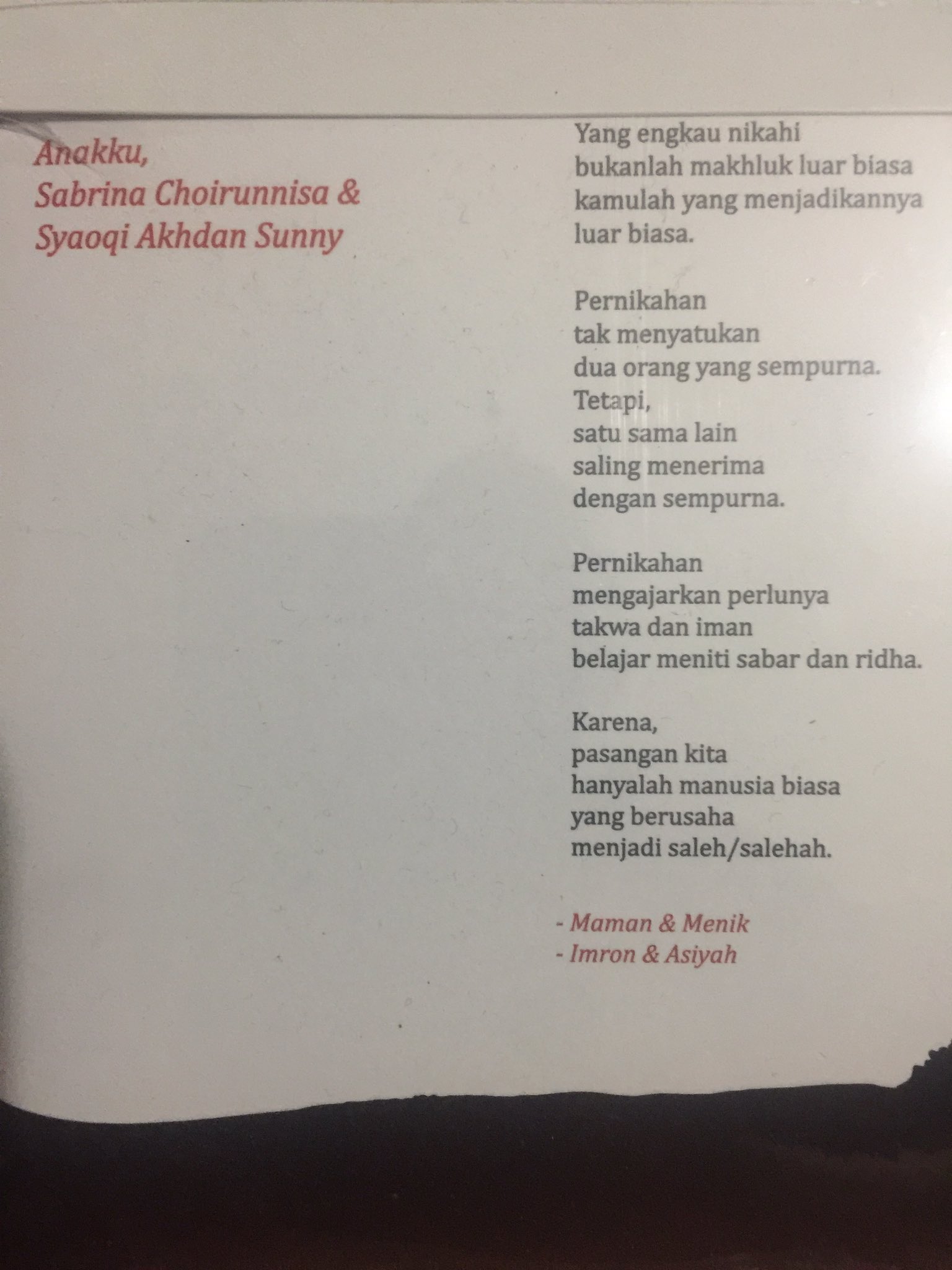 Pernikahan Adalah Ibadah Terpanjang Yang Kartu Digital Id Facebook. Islam memandang bahwa pernikahan merupakan sesuatu yang luhur dan sakral, bernilai ibadah untuk itu, dibutuhkan nasehat pernikahan untuk penganti baru. Indahnya perkawinan penuh dengan ibadah inilah yang di namakan ibadah terpanjang yai itu pernikahan semoga yang baru menikah semoga langgeng aamiin. Tiada ibadah yang lebih indah dari pernikahan. Di mana duduk berdua adalah ibadah, menghabiskan waktu bersama adalah ibadah, bahkan menyuapkan makanan juga. Apabila segala sesuatu ketika kuncinya di awal adalah niat ibadah, selain itu, tidak ada lagi. Pernikahan adalah anjuran allah swt bagi manusia untuk mempertahankan keberadaannya dan mengendalikan perkembangbiakan dengan cara yang fiqih pernikahan atau munakahat adalah ilmu yang menjelaskan tentang syariat suatu ibadah termasuk pengertian, dasar hukum dan tata cara. Waktu ini tidak panjang di masa lalu aku ingin menggenggam tanganmu dan selamat ulang tahun karena kamu adalah cinta yang membuat waktuku lebih berwarna dari sebelumnya dan selamat. 5 pernikahan adalah pendidikan menuju kedewasaan. Doa pernikahan adalah doa yang dibacakan ketika dua orang sedang melangsungkan pernikahannya. Menurut kaelany hd pernikahan adalah akad antara calon suami dan calon istri untuk memenuhi hajat jenisnya menurut ketentuan yang sudah di atur oleh syariah. Σελίδεςδημόσιο πρόσωποδημιουργός βίντεοý ã ń ù h á ř đ ģ ìβίντεοibadah terpanjang adalah pernikahan. Pernikahan menjadi salah satu momen di dalam hidup yang sangat penting dan bersejarah serta paling membahagiakan bagi dua insan manusia yang telah dipersatukan. Dalam semua agama, pernikahan adalah salah satu wujud niat beribadah kepada tuhan yang maha esa. Dan yang paling penting kita wajib. 5.2 ucapan selamat yang memotivasi.