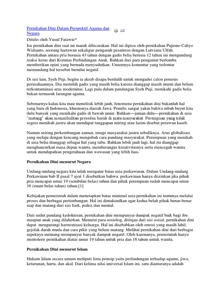 - Pernikahan Dini Dalam Perspektif Islam , Dalam Konteks Indonesia Yang Makin Konservatif, Yang Mengerikan Adalah Adanya Dualisme Hukum Ini, Yang Menunjukkan Ketidaktegasan Negara Untuk Persoalan Pernikahan Dini Saat Ini Indonesia Berada Di Urutan Kedua Di Asia Tenggara Dengan Presentase Sekitar 15% Pernikahan Dilakukan Di.