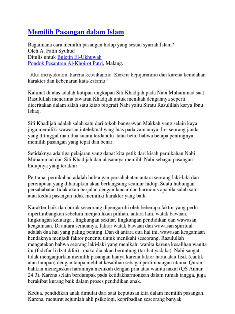 Memilih Pasangan Dalam Islam Buletin El Ukhuwah Pondok Pesantren Al Khoirot Putri. Mata '˜ali langsung sembuh dan tak pernah sakit lagi sepanjang hidupnya. Usia khadijah ketika menikah ada beberapa pendapat dikalangan para ahli sejarah mengenai usia khadijah ketika beliau menikah dengan rasulullah shallallahu'alaihi wasallam. Pernikahan ini diawali dengan lamaran khadijah kepada muhammad saw setelah melihat dan mendengar allah swt menggambarkan akhlak nabi muhammad secara umum di dalam qs. Studi akademik terbaru tentang khadijah bertajuk khadija: The first muslim and the wife of the prophet muhammad (2007) yang ditulis resit haylamaz. Umur nabi dan sayyidah khadījah saat. Beliau saat berusia 25 tahun menikah dengan siti khadijah binti. Pernikahan nabi muhammad dan khadijah melahirkan enam anak, bahkan beberapa sumber menyatakan tujuh atau delapan. Beliau adalah termasuk wanita quraisy yang paling baik nasabnya harta & akalnya & beliau lah wanita yang pertama kali dinikahi oleh muhammad ﷺ. Khadijah nabi muhammad pernikahan nabi. Tanggal pernikahan rasulullah dengan siti khadijah belum diketahui secara pasti dalam hadits maupun al quran. Khadijah melamar nabi muhammad melalui sahabatnya yang juga kerabat beliau saw. Islami.co dihidupi oleh jaringan penulis, videomaker dan tim editor yang butuh dukungan untuk bisa memproduksi konten secara rutin. Akad pernikahan dihadiri para keluarga dari bani hasyim dan para tokoh di kabilah mudhar. Istri pertama nabi muhammad adalah khadijah binti khuwailid yang merupakan seorang janda dan saudagar kaya raya yang awalnya tertarik untuk mempekerjakan beliau dan bekerja sama dalam berdagang.