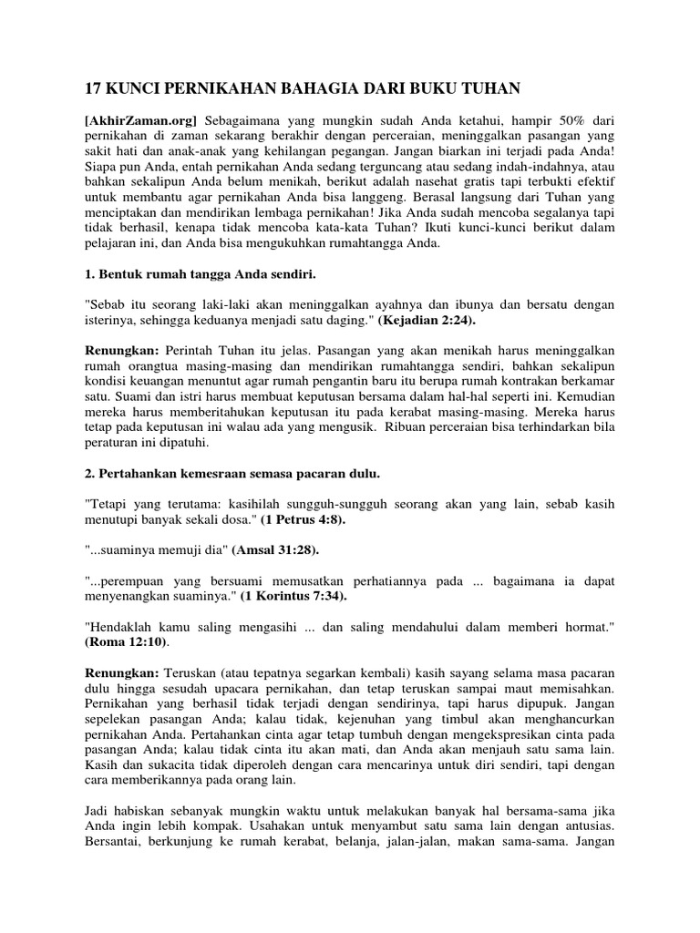1 Pernikahan Bahagia Book Pdf Download Gratis. Tetapi fu rong yang mencoba mengubah segalanya justru dia sama sekali tidak dapat menghindari takdir yang akan datang padanya. Pernikahan tidak bahagia tidak akan pernah membuat anda merasa aman dan dihargai. Sebuah pernikahan yang bahagia harus dipersiapkan dengan baik. Mengutip kata mutiara pernikahan berarti anda sedang berpikir untuk menata masa depan bersama sang pujaan hati. Karena pernikahan kakaknya yang tidak bahagia, dia bersumpah untuk menentukan pilihan hidupnya sendiri. Banyak yang memasuki pernikahan dengan harapan yang tidak realistis dan ketika mereka tidak mendapatkan harapannya atau tidak terpenuhi, rumah tangga jadi tidak bahagia. Pernikahan yang gagal dan rumah tanggah yang terpecah belah begitu menghancurkan sang suami dan istri, belum lagi jika mereka mempunyai anak. Namun, bagi mereka yang menjalaninya tak semudah itu. Tapi terkadang ada pernikhan harus kandas/ tidak ada kebahagiaan di dalam nya. Pernikahan bahagia tediri dari dua orang pemaaf. seperti sepasang sepatu, berdua namun tetap satu. Dari kacamata orang luar, meninggalkan sebuah perkawinan yang beracun tidak membutuhkan usaha. Ada juga kasus di mana pasangan yang mulanya jatuh cinta dan kehilangan rasa ketertarikannya pada pasangan. Karena satu saja tidak akan berguna. Penjelasan ini bukan berarti bahwa allah berkehendak mengurung kita dalam pernikahan yang tidak bahagia. Dia memiliki kemampuan meramal dalam mimpinya.