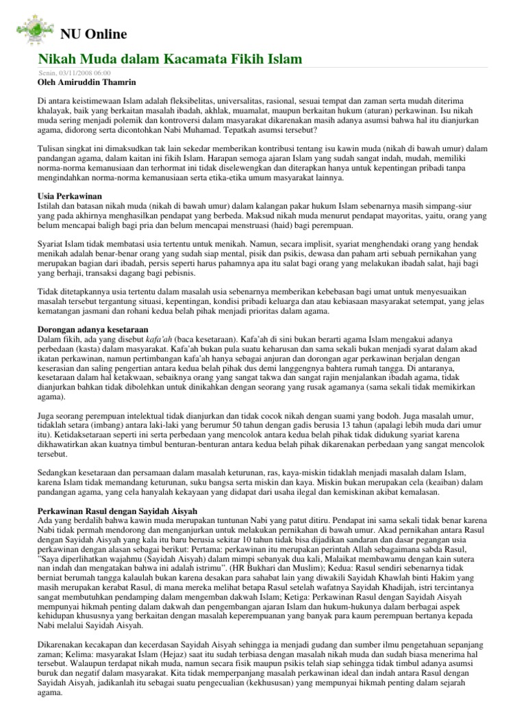 - Tafsir Ulang Teks Terkait Usia Pernikahan Rumah Kitab : Perintah Untuk Menikah Dalam Al Qur¶An Dan Sunnah Nabi.